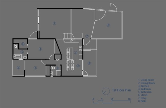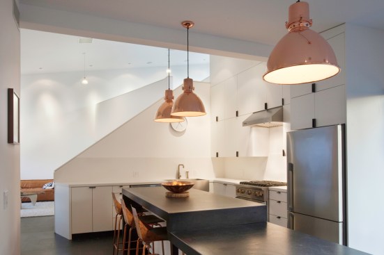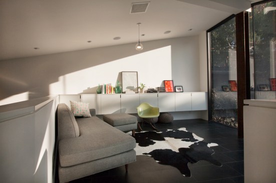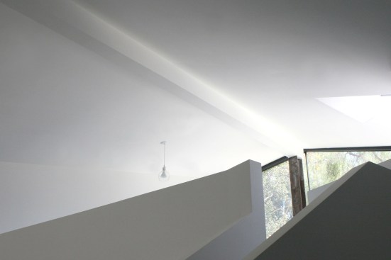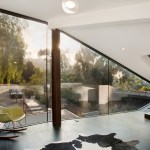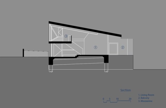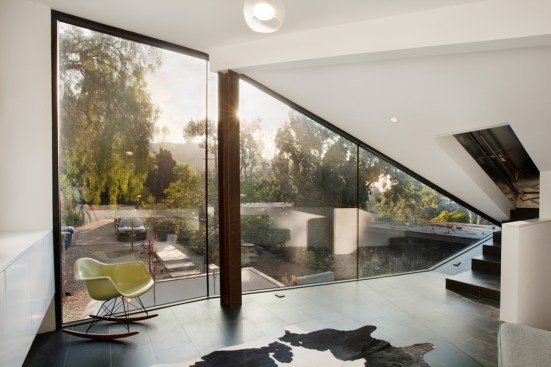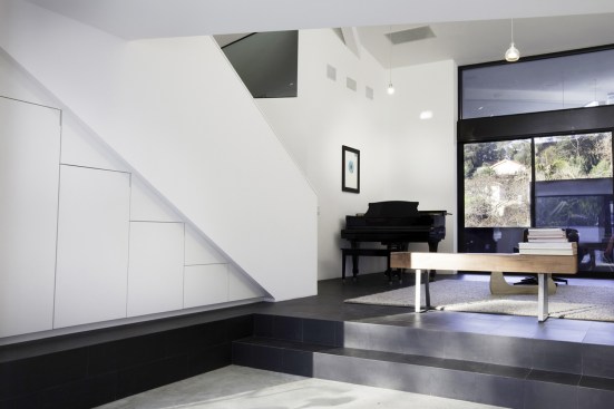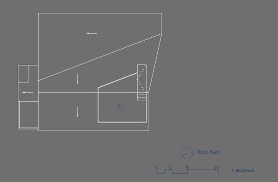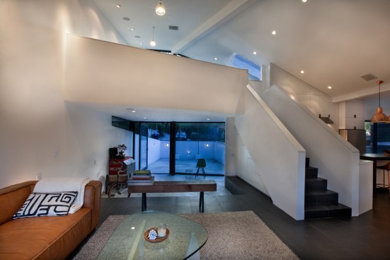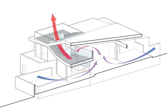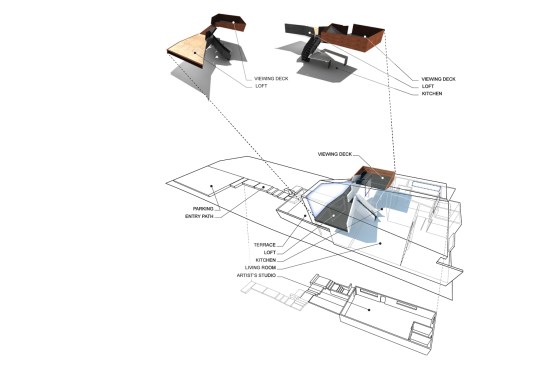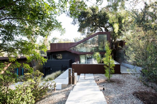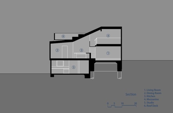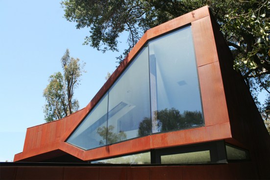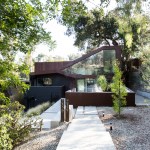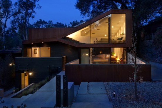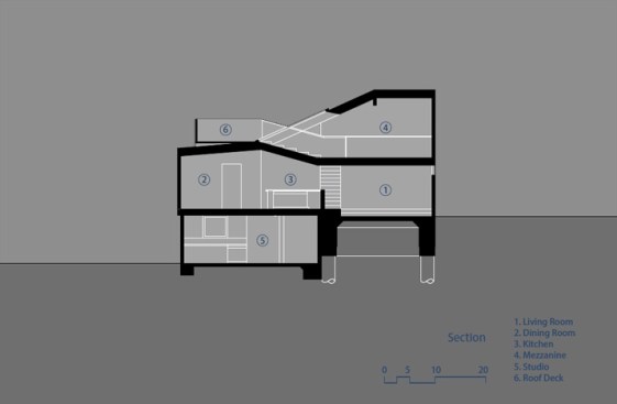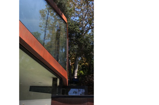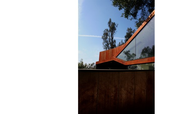 The project site for this residence is a 7,500 sf cross slope lot in the Silver Lake neighborhood of Los Angeles. The property is located near the top of a significant hill with panoramic views towards the Silver Lake Reservoir. The residence is situated at the rear of the property providing ample garden spaces at the front to buffer the exposure to the high traffic street. Due to the adjacency of neighboring properties, primary opportunities for open space occur toward the East and West, while views are primarily to the North within the parcel. Due to the owners’ desire for a conjoined residence and studio, coupled with our interest in passive environmental controls, and the potential for expansive views of the Silver Lake Reservoir and surrounding hillside topography, the strategy for this live/work residence emerged as a series of tightly stacked spaces unfolding and engaging the multiple landscapes of the site. The garden level studio has separate access directly from the entry path and parking. The densely packed studio is contrasted by the sparse living quarters that occupy the main floor and the mezzanine above. The studio and the private components of the residential spaces above are clad in a dark stained cedar siding, while the public spaces of the residence are wrapped in a weathering steel exterior skin. The steel skin and its associated plaster interior liner form a spatial manifold that envelops the residence and provides autonomy between program as required, while expanding the compact interior living spaces into the landscape at every opportunity. This expansion effectively doubles the useable living space of the residence. The sectional geometry of the residence, the multiple operable apertures located around the perimeter, and the operable hatch connecting the mezzanine and the roof deck completes the passive environmental cooling strategies employed. Through the adjustment of the various building apertures, stack ventilation and convective cooling is achievable.