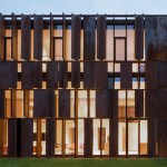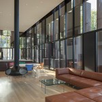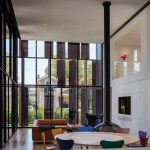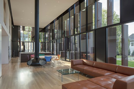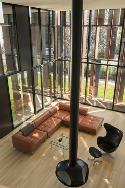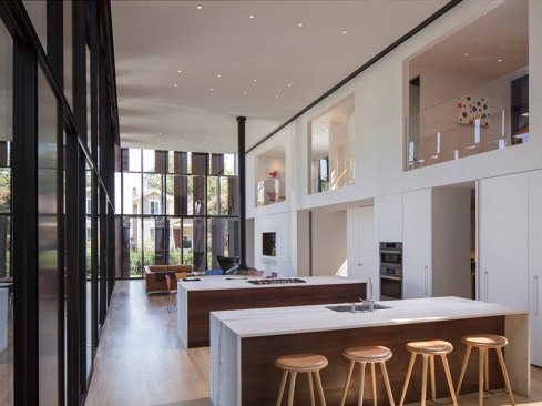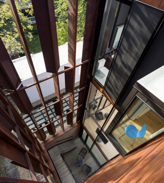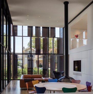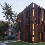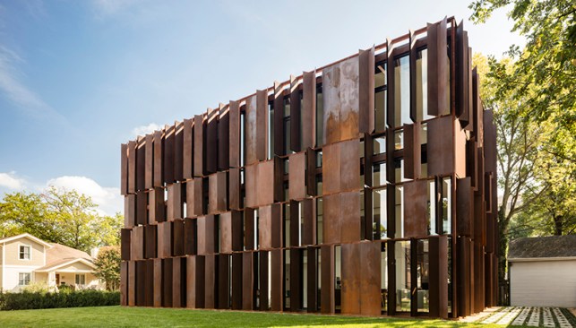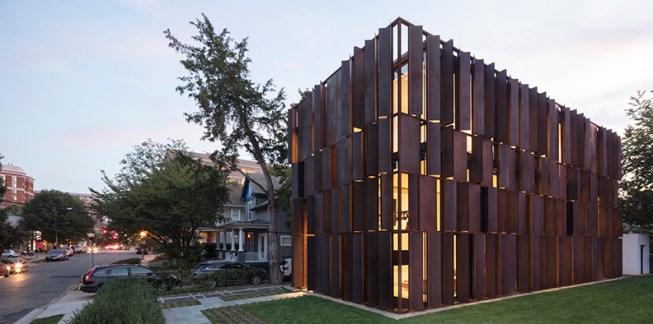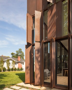 David Jameson, FAIA, and his team decided to respond to both and neither, creating a building that escapes any easy typological identification and becomes its own thing altogether. Structurally, it comprises three layers, featuring a dark steel–framed, glazed curtain wall surrounded by a full jacket of steel louvers, each fixed in place at a distinct angle to the next and weathered for a textural finish. The effect, as seen from the street, is of a beguilingly abstract pattern, as though the whole design was simply an iterative study in opacity and transparency. In fact, the three-story building makes for a highly functional domestic environment, with a double-height living room and top-floor bedroom suite affording just the right combination of light and privacy thanks to its striking exterior shutters.