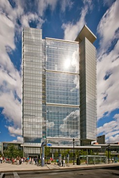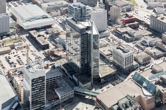 The original target of 60% energy reduction has been exceeded by 77%, and the design is in fact 80% more efficient than conventional Winnipeg buildings, making it the third most energy efficient large scale building in the world. It is also the first large-scale office tower in North America to be LEED Platinum-certified.