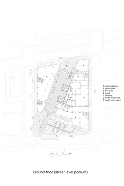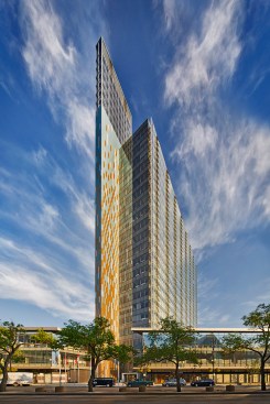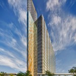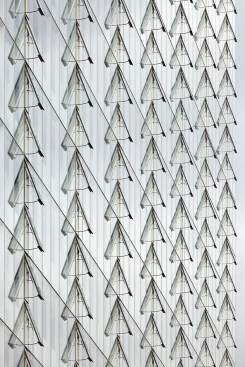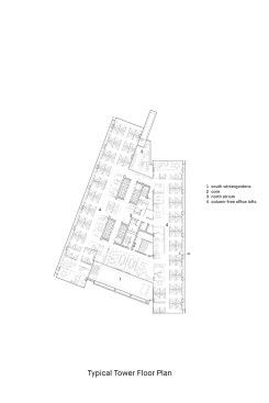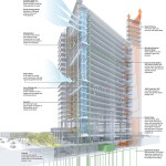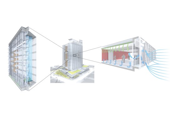 The fully integrated design capitalize on Winnipeg’s unusual abundance of sunshine and dominant gusting south winds to harness passive solar and wind energies. The capital ‘A’ form of the tower comprises two wings fused at the north and splayed open to the south. The splay is filled with three, six-storey stacked atria / ‘winter gardens’ that act as the lungs of the building and feature 24-metre-tall waterfalls which humidify/dehumidify (dependent on the season) incoming air.