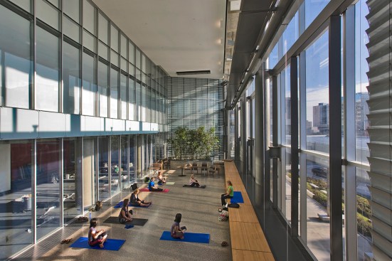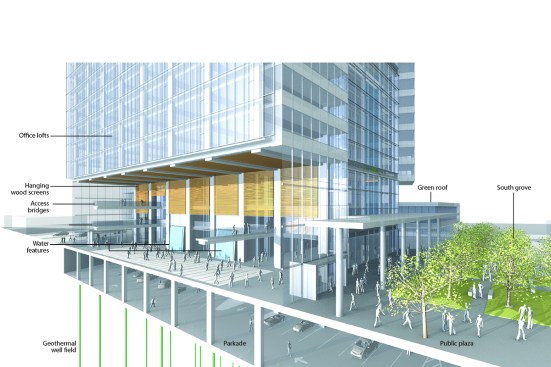 Manitoba Hydro Place introduces a new paradigm to lead the AEC industry to a carbon-neutral future using a formal Integrated Design Process. Every element melds performance and aesthetics: solar chimney, wintergardens, waterfalls, thermal mass, vertical neighbourhoods, double façade, geothermal, public park, public galleria. Every part of the whole was conceived and designed in the service of providing a healthy supportive workplace for Hydro’s greatest asset – its people. The outcome is a reduction in absenteeism (1.5 days per employee) and massive energy savings.
