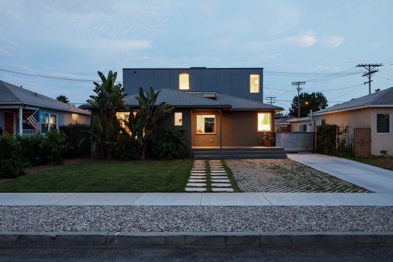 Project data, program and constraints: R1 Zone/Maximum FAR: 0.5 2572 sf, 4 Bedroom/4 Bathroom single-family house flexibly planned 2-story L-shaped volume grafted to the front half of an existing 1940s one-story bungalow, which itself was remodeled during construction. The house incorporates an attached town-house accommodating both an extended family member and allowing future revised room assignments.