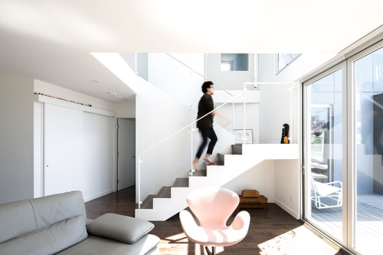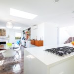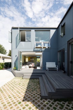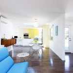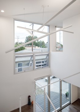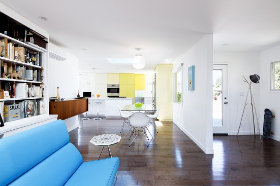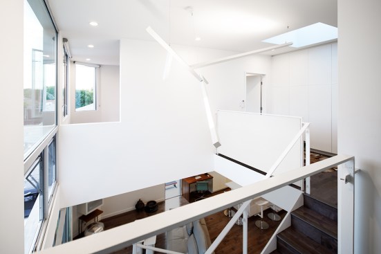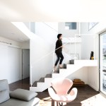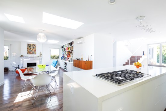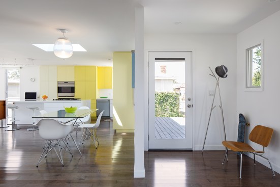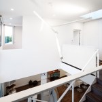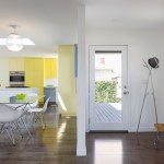 Keeping the front of the existing house relatively untouched, save for adding 2 skylights, insured that the scale and appearance of the building would not remarkably depart from that of the existing street. Silently peeking above the existing roof line is a simple plane outlining the second floor of the addition beyond. Two upper windows give clues that things behind that wall are a little bit … different.