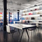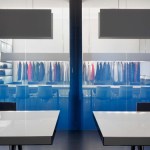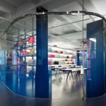 Offices line the north perimeter of the building; a large expanse of windows lines the western exposure, and two windows face south. A curvilinear glass form at the heart of the space is the design’s central organizing element, defining separate zones for merchandise while still allowing sunlight to filter deep into the space. The glass is imprinted with a gradient frit to create a subtle visual screen that provides privacy for seated guests and sweeping views of the full showroom for standing visitors. Throughout the showroom, opaque design elements are arranged laterally to allow maximum penetration of daylight to the interior.