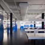 During the day, sunlight streams through the windows and reaches deep into the floor plate, thereby reducing reliance on artificial light. Desks were equipped with LED task lighting, and motion sensors were installed in back-of-house program areas to conserve energy use.