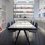 The shape of the glass enclosure responds to the program as well as the structural condition of the building. Corian and polished stainless steel tables, overhead light fixtures, jewelry displays, and sculptural necklace display forms were custom designed as contemporary alternatives to traditional, off-the-shelf pieces.