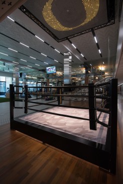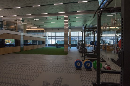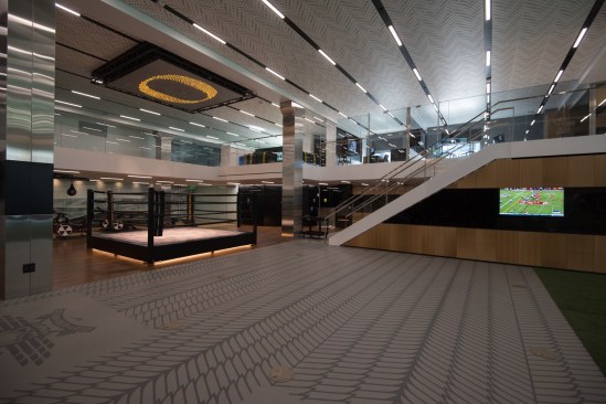 The Sports Science Unit has active and passive recovery rooms. In the active room athletes stretch and perform low-impact activities monitored with markerless motion capture cameras. Passive recovery rooms offer massage therapy, pneumatic compression units, and sleep pods so athletes can rest between practices. The Physiology area has a no-fighting boxing ring for mental agility conditioning, heavy bags, speed bags, exercise bikes, as well as a neurocognitive center for concussion diagnostics. The Movement area includes a 40-yard running track with motion capture cameras and ground force plates.