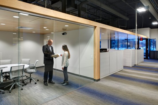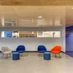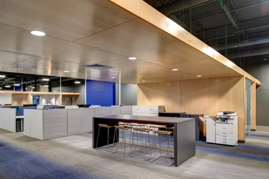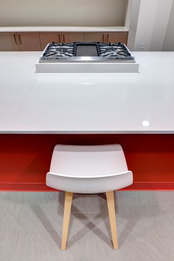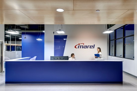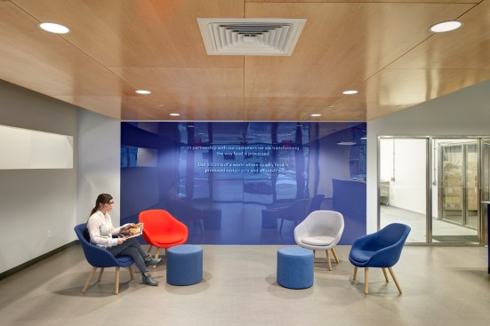 The interior architecture of this space, used by a manufacturer of food production machinery, is to reinforce this multinational company’s commitment to innovation. The design began with the procession of staff and visitors. A path was plotted from the front door, where visitors are given views of test kitchens and equipment demonstration areas, and led visitors through the facility along a datum referred to as the “Innovation Corridor”. This corridor takes everyone passed and through the business activities of accounting, customer service and marketing, where it ultimately leads to the engineering department aptly titled “Innovation.”
