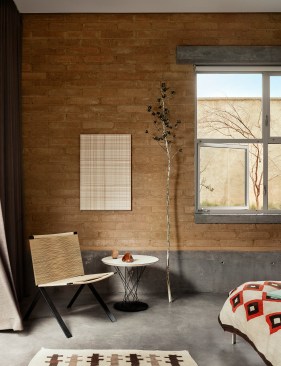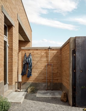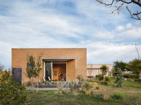 With an exterior made out of compressed-earth blocks, the house presents as a rough-hewn, rustic form—an impression that carries through the modestly scaled interior with its exposed concrete floors. The site plan, including intimate garden enclosures planted with indigenous flora, is carefully calibrated to make the house feel like a part of the vast, unpeopled ecosystem, and its simple unobtrusive silhouette won’t spoil the view from the neighbor’s ranch. Yet Marfa Suite is also a very comfortable—and decidedly luxurious—machine for contemporary living, equipped with operable skylights, radiant-heat floors, and custom wood furniture and closets.