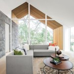 So significant is this door to the overall design that the windows on the second story were spaced to match the door’s vertical mulls. When the door is closed, the window’s vertical mulls line up. They do not, however, terminate at the apex of the hemlock-lined roof ridge, where the eye expects. Instead there’s a slight offset that mirrors White’s playful asymmetric interpretation of the farmhouse silhouette.