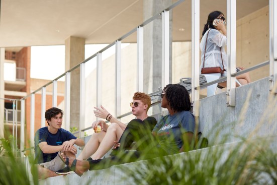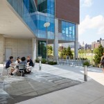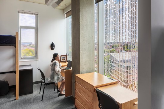 The overall mass of the building has its own tiered expression to provide a transition between the scales and materials of the neighboring residential halls. Brick, glass and concrete are carefully brought together to create a unique but unifying composition. The brick is authentically expressed as a thin layer, and peeled back to reveal the public spaces. Here in these spaces, the glass allows for the best views and daylight, drawing students out of their rooms. A variety of lounges—for both socializing and study—gives these students many options and opportunities to engage with new friends.