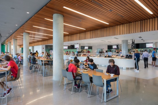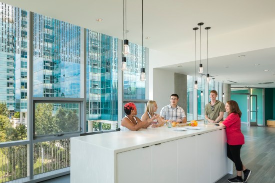 The dining room is the heart of this home away from home. Students are given plenty of choices: A quiet spot by the window at the counter to people watch, relaxed companionship at a communal table, or a booth with new friends. Flexible, communal areas on the living floors can accommodate groups of varying sizes and activity levels; residents congregating in shared kitchens enjoy a unique amenity—sweeping vistas of the UC campus itself.