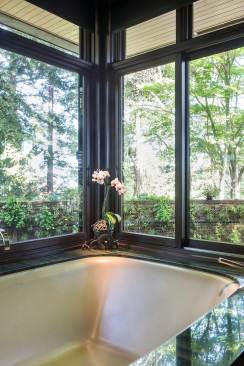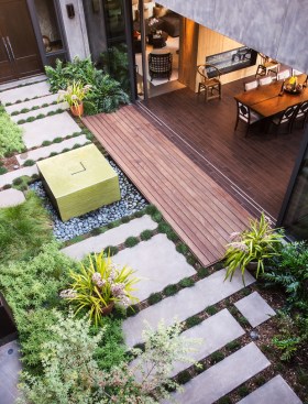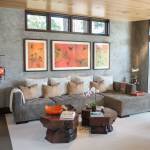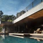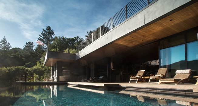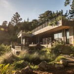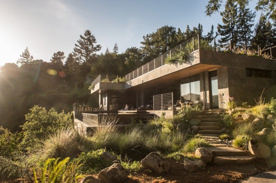 Low-slung and with a living roof, the home blends in perfectly with both the adjacent redwood forest and the owner’s desire for low environmental impact. Built to LEED Gold standards, it features solar and geothermal power, gray water, water catchment systems, and is water and rain resistant.