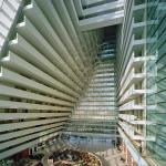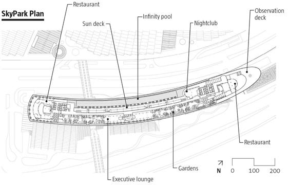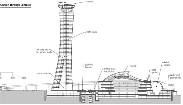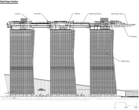 The Marina Bay Sands Restort, in Singapore, is easily noticed by its three 55-story towers overlooking Marina Bay. The sloping geometry of the towers required the structural engineers at Arup, particularly the bridge and tall-building specialists, to devise a strut-and-tension-cable system to support the walls during construction.A low-rise, undulating podium in front of the towers houses a vast array of entertainment venues. Because of space constraints, Safdie built the three-acre SkyPark, 656 feet in the air, by bridging the tops of all three towers at the 55th story. 9,000 silver-painted, metal-composite panels enclose these mega trusses.