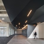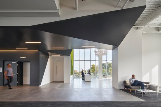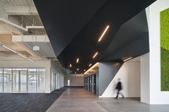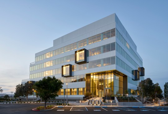 The 7000 Marina Boulevard building includes approximately 85,000 square feet on six floors. Originally built in 1986 as the headquarters for plush toy manufacturer R. Dakin Co., the building possesses strong architectural characteristics, now enhanced with increased access to light and views—attributes desired for modern offices. By replacing the existing awning windows with floor-to-ceiling high-performance insulated glazing, the architects maximized views and daylight while improving thermal performance. Exterior walls further push outward on existing cantilevered slabs to create pop-out areas for informal breakout spaces and small meeting pods that showcase collaboration from the inside out. New exterior feature lighting highlights the new elements and provides a distinct street view of the building at night.