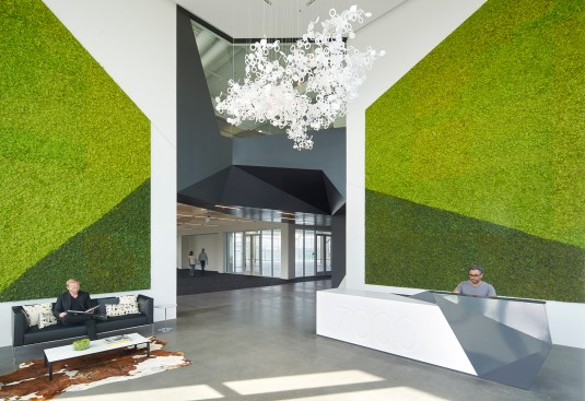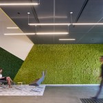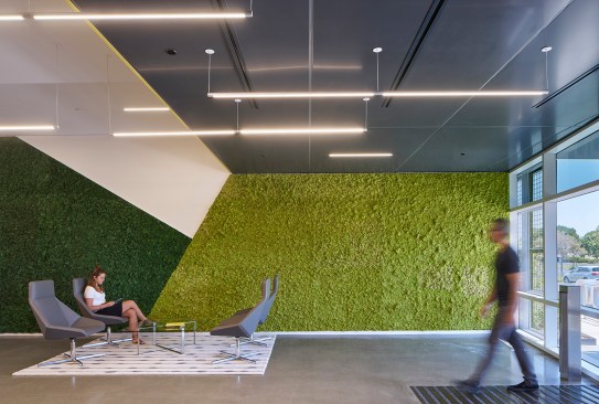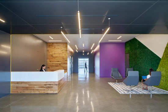 The main entrance of 7000 Marina was rotated from the south to southwest side of the building to directly relate to the 5000 Marina building. The entrance opens to an expansive two-story lobby with green walls, custom front desk, and renovated elevator lobby. The lobby provides direct access to the building’s impressive five-story atrium, which was previously built out as office space. Blitz removed the existing wall components to expose the structural steel. Designed for ultimate flexibility, the large open space includes area for a multi-use stage for meetings and events. Large roll-up doors and an outdoor patio create collaborative space that can easily expand to the exterior. The atrium can also be used as a main employee gathering and all-hands area for both buildings.