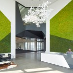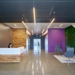 The interior scope for 5000 Marina includes a complete gut of the office floors as a build-out of a common lobby with a green wall. Floor and wall graphics correspond with its neighbor to the north. A custom, reclaimed-timber security desk is the focal point of the lobby entry. Graphics on the main floor harken to the nearby airport and provide distinctive wayfinding.