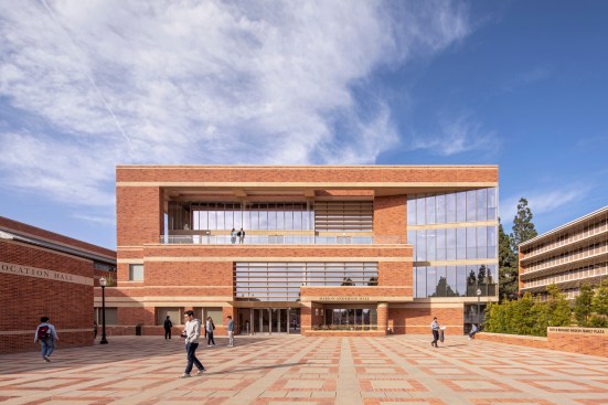 This addition to the original Anderson School complex creates a bold campus presence that reimagines UCLA’s traditional four-color blended brick and buff-colored cast-stone masonry banding. Transforming a condition long considered an unsightly barrier between the school and the core campus, the design sites the building atop an existing parking structure east of the original complex, framing a new pedestrian plaza and cascading grand stair to the south. The result is a new primary entrance to the school that also serves as a dramatic gateway to UCLA’s North Campus.