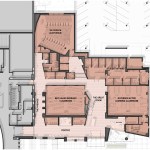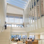 At the heart of the building, a five-story stepped atrium houses a rich array of interactive social and learning spaces. Bringing natural light to the interior while providing access to the event space and terrace overlooking the south plaza, the atrium’s engaging stepped profile reflects the energy and forward-thinking spirit of the community the building serves.