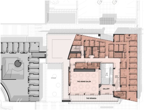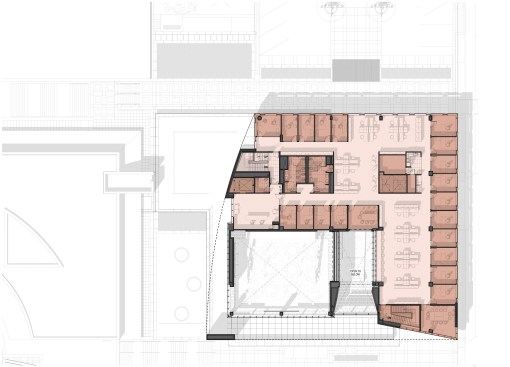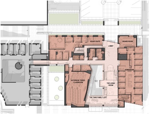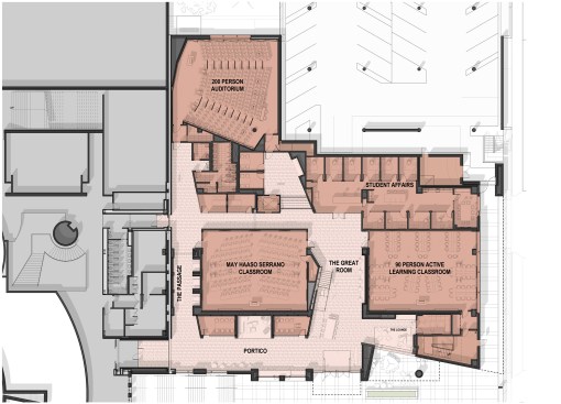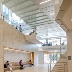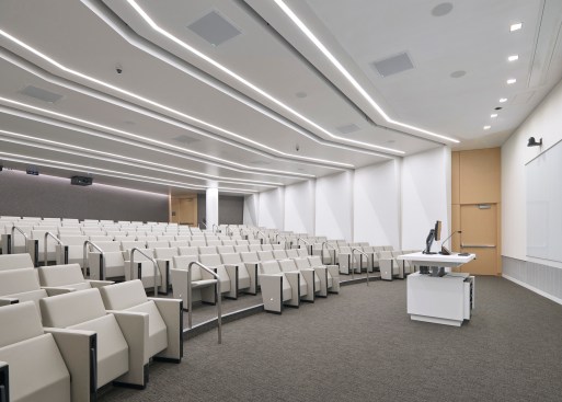 Inside the building, state-of-the-art, acoustically optimized spaces are designed to support evolving models of business education. In addition to administrative offices, the dean’s suite, and case-study and lecture classrooms, the facility includes a double-height event space and shaded terrace overlooking the plaza and a dynamic indoor-outdoor environment at the lowest public level.