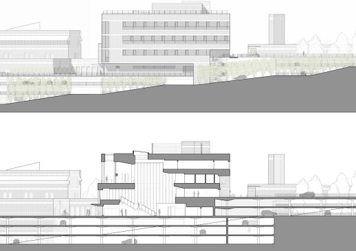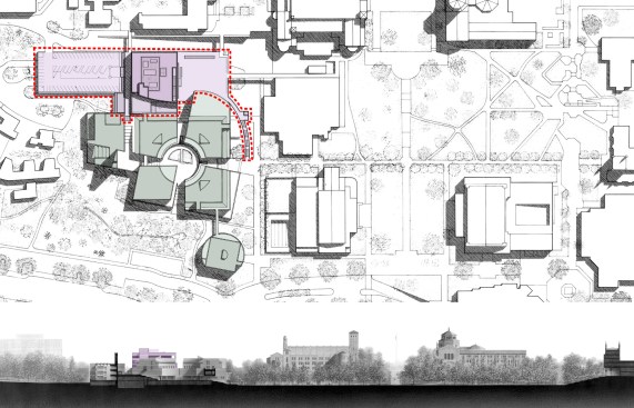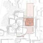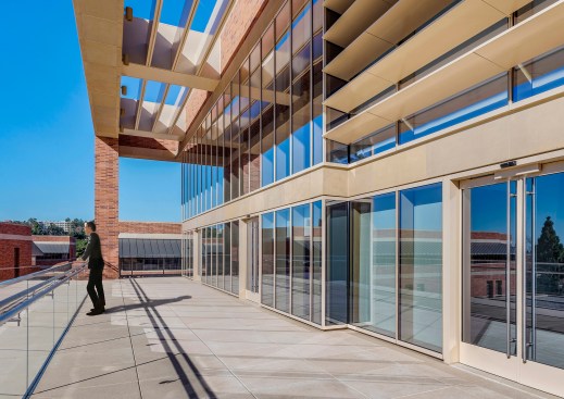 Constructed atop a parking structure edged by sloping Royce Drive, the building includes a second entry and landscaped vehicular arrival plaza on the north side, accessible from the top deck of the garage. At the lowest level, an east-facing passage provides access from the garage to the south plaza and the campus beyond.