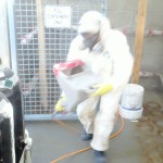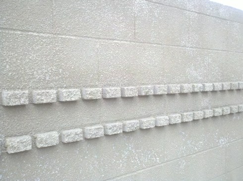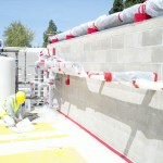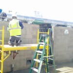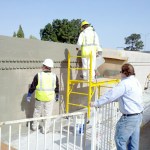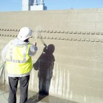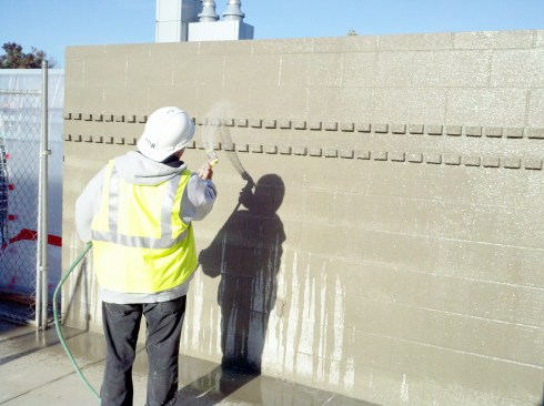 Pressure washing the walls clean of dirt and contaminates, we then began applying Kryton T1 and T2 waterproofing by hopper gun to 2400 square feet of block walls and caps.