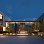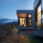 The house is conceived as three separate pods connected by transparent links. The pods are pure forms with eroded corners, cantilevering over solid bases. Recessed dark framed windows tie into solid dark panels with deep shadow lines. The windows and paneling are offset by light, rough textured, vertical wood siding, and crisp horizontal metal siding; both siding materials respond to and are harmonious with the surrounding landscape of scrub oak and sage brush. The cantilevers are accentuated as the site drops off into a deep ravine, perching the occupants above the creek below.