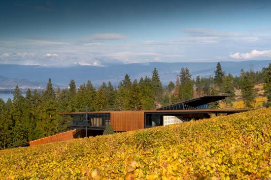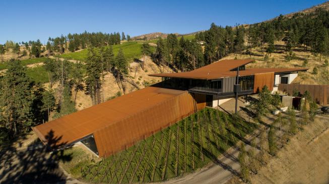Tucked into a hillside in Kelowna, British Columbia, the design of the newest von Mandl Family Estates winery draws a close parallel between the topography of the land and the gravity-flow winemaking process taking place inside. Conceived of as a rectangular form with a central split or “fracture” down the middle opening the building to daylight, the production side of the building follows the direction of the site, utilizing the downhill slope for its gravity-flow process. The other half containing the visitor area cantilevers out over the vineyards, offering sweeping views of nearby Okanagan Lake and the iconic belltower of Mission Hill Winery, von Mandl’s first winery in the region, also designed by architect Tom Kundig.