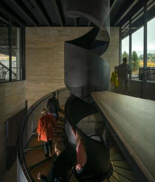 Visitors enter the facility through a rough formed concrete tunnel and then to a private tasting room accented by a glass and perforated-steel wall that overlooks the barrel storage area. A custom-designed and fabricated spiral steel staircase leads up to a larger tasting room and visitor experience area with perforated steel on the outside and solid steel inside. The form of the staircase was inspired by the stainless steel filtering equipment used in the wine industry, as well as by the Fibonacci sequence that reflects how grapevines propagate. Much like the building itself, interior details tell the story of the bespoke, high-quality winemaking process that VMF Estates has worked for decades to refine.