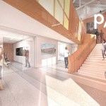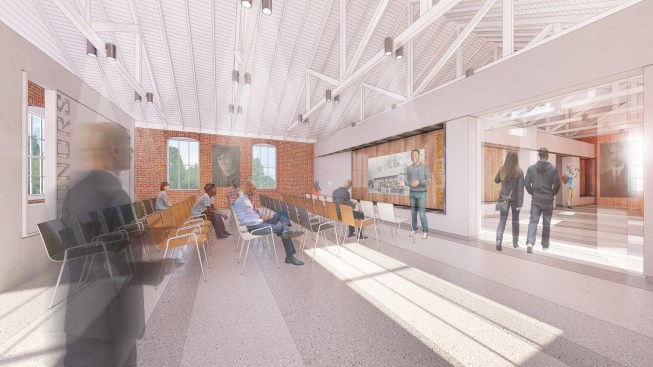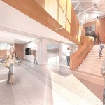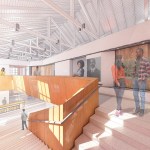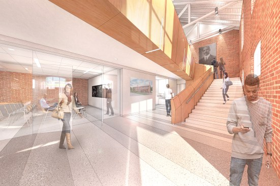 Cantilevered canopies will shelter a new entrance and a wide glass vestibule to welcome visitors to the complex. The interiors’ simple palette of wood, glass, gypsum board, and terrazzo allows the exposed original masonry walls and wood trusses to provide a legacy-filled framework for the new activities.