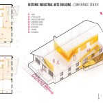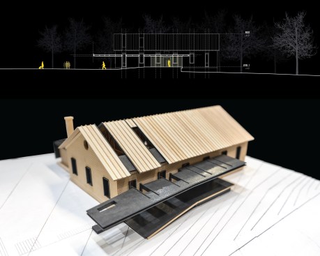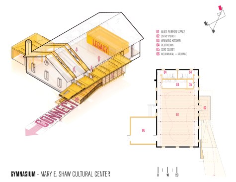 Evoke Studio Architecture’s renovation proposal transforms the industrial arts building into a two-story conference center, with a variety of meeting rooms, a gallery space, and offices. The single-story gymnasium becomes a cultural center with a multipurpose space under its restored trusses. The design uses a common language of architectural intervention, inserting carefully crafted canopies and additions that feature dark gray aluminum-composite panels with wood insets and glass juxtaposed against the existing brick masonry envelopes.