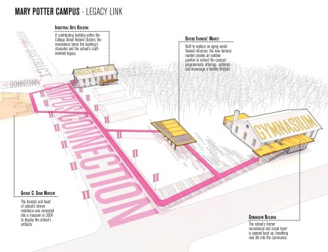 The Mary Potter Academy was formerly one of the largest landowners in downtown Oxford, but just three of its buildings remain: the founder’s residence, a museum since 2004; a 9,600-square-foot brick-and-wood-framed industrial arts building, which has been vacant since the 1990s; and a similarly scaled gymnasium structure. The industrial arts and gymnasium structures were originally constructed by the students, so it was important to the designers that new interventions honor the craft-oriented legacy these buildings embody.