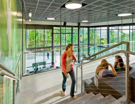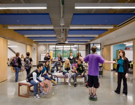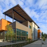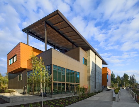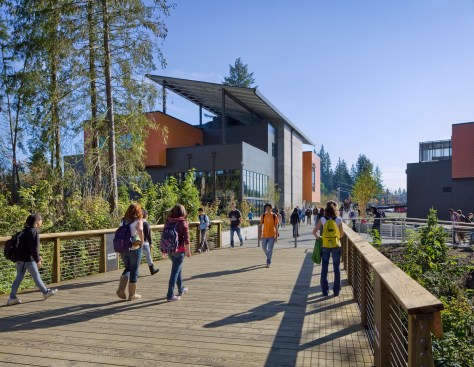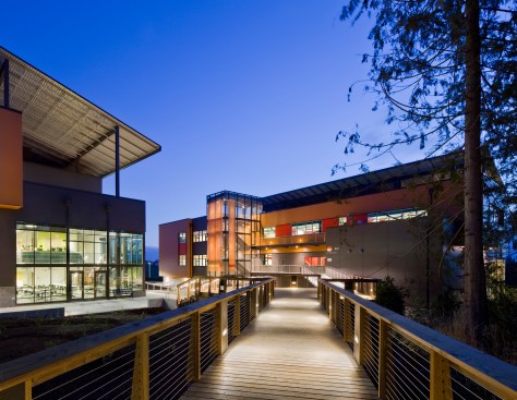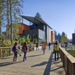 Set among second-growth trees, forest wetlands, and with sweeping territorial views, the Marysville Getchell Campus comprises four schools that excite a student’s senses with innovative learning environments. DLR Group’s design of the new high school campus enables great flexibility in the administration of student-focused learning. Responding to the District’s adoption of a new, small learning community (SLC) model, the design arranges four independent SLC buildings and the shared-use Campus Commons around second growth forest. Within each SLC building, a series of interconnected learning spaces support the educational approach described by the District’s Five Guiding Principles: Relationships at the Center; Focused Learning; Identity and Purpose; Community; and Accountability. Generous glazing and intriguing outdoor learning spaces create a sense of connection to nature and community. It’s this openness and connectivity that make every space a learning space at the campus, and which encourages student growth as global citizens.