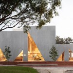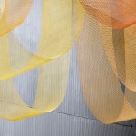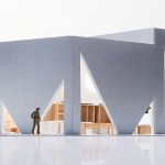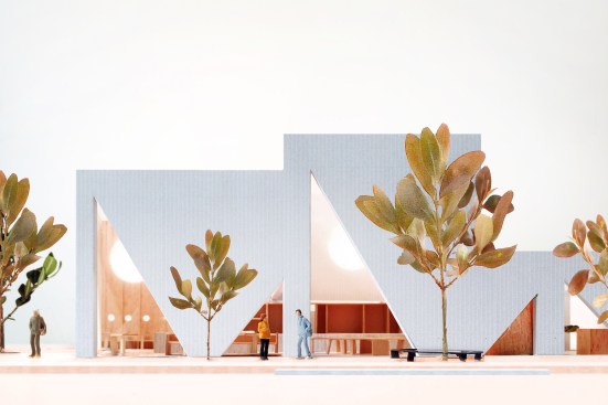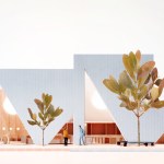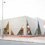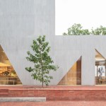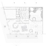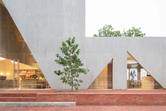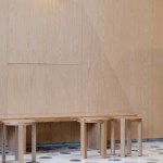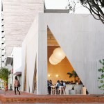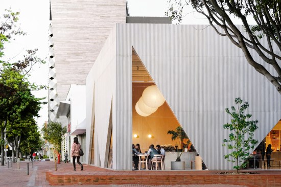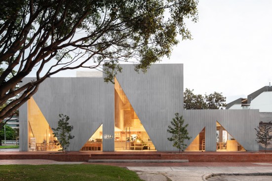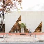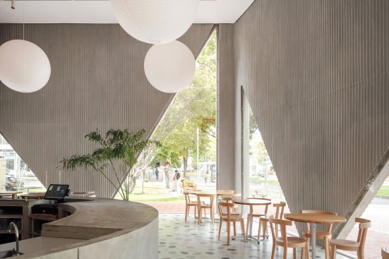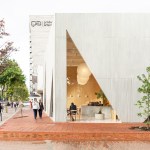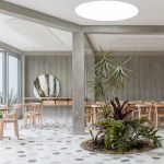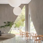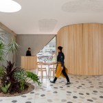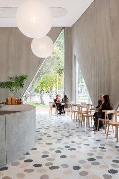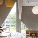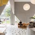 A playfulness continues in the surfaces, fixtures and furniture, all designed by Studio Cadena. Distinct sculptural lighting designs serve to distinguish the different volumes – large paper globes light the corner café, while hand-painted metal mesh hung from the ceiling catches the natural light in the middle volume. A unique floor made from large, hand-cast terrazzo tiles embedded within traditional terrazzo covers the interior public spaces. The walls are made of textured, cast-in-place concrete.
