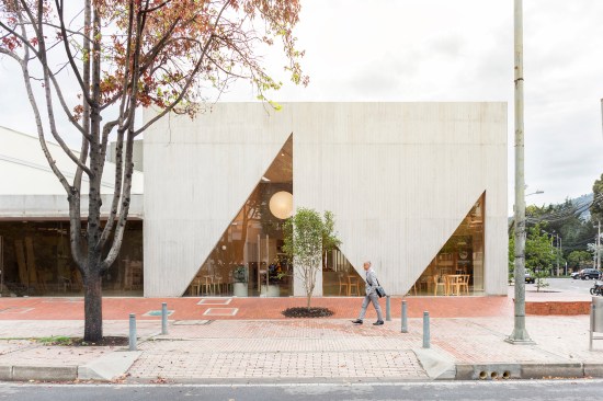 From the exterior, the triangular cutout windows and entry open the facade to the street, meeting the life of the sidewalk and revealing the life within the restaurant. The geometric windows, including a large circular window that looks into the garden from the kitchen, adds to the playful, graphic quality of the space’s indoor-outdoor language. Says Cadena, “This project’s indoor-outdoor continuity is intentional, but presents a challenge in Bogotá, where the weather is perennial spring or fall, and can be cold, chilly, or wet. In this case we wanted to be sure that you could always feel the presence of what’s being made here, and that the space remained open to itself and to the street, and was inviting to the city.”