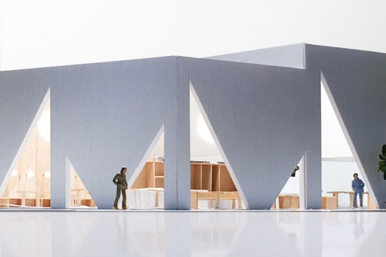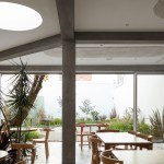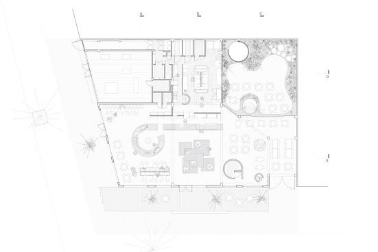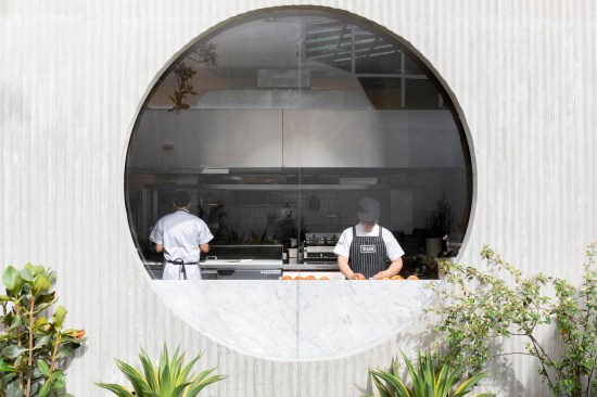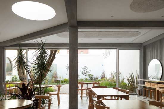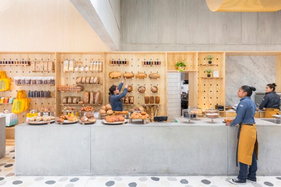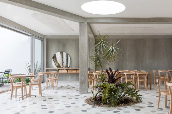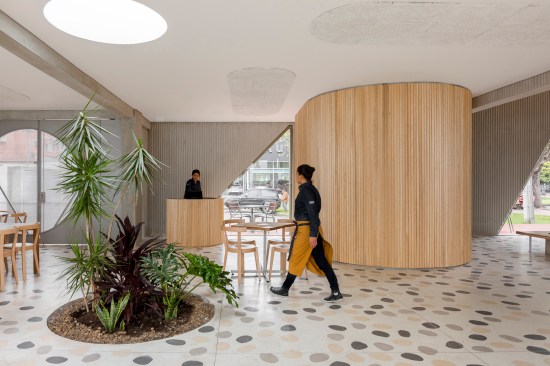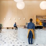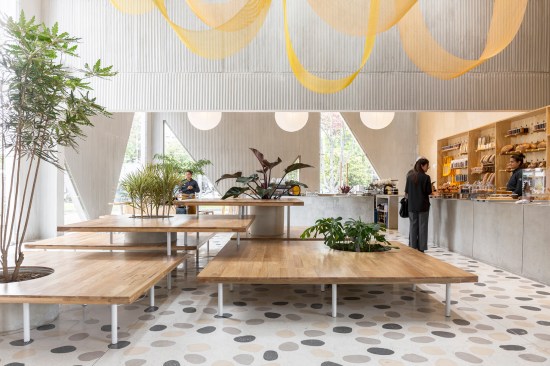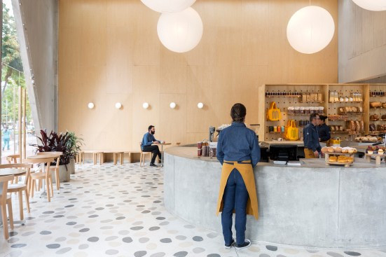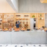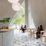 The 7,500-square-foot restaurant is organized as a grouping of distinct but interconnected volumes, each with a particular function. At one corner sits a cafe and bakery, which flows into central entrance area that is adjacent to a dining volume and separate retail space. An outdoor patio space provides garden seating and connects the public spaces to the kitchen in the rear. Elements such as a long concrete bar, cylindrical wood-clad service station, and a multi-tiered seating platform at the entrance serve to modulate the space. Says
