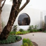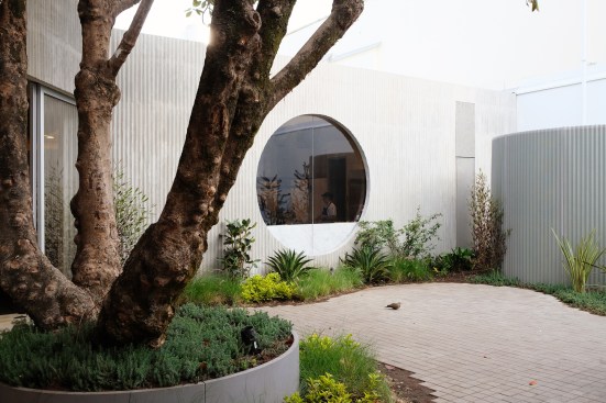 -Geometric windows, including a triangular cutout window on the exterior and large circular window that looks into the garden from the kitchen, adds to the playful, graphic quality of the space’s indoor/outdoor language