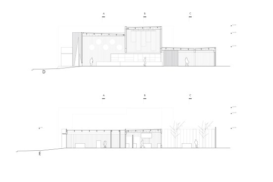 -Elements such as a long concrete bar, cylindrical wood-clad service station, and a multi-tiered seating platform at the entrance serve to modulate the space