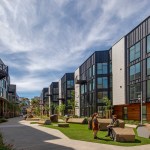 DBA relied on a simple material palette to create cohesion between the structures, as well as the firm’s g2 Lofts. The architects balanced affordable materials, such as Hardie board random batten siding, with higher-end accents, including zinc bays and a copper façade for the leasing pavilion. Touches of durable, FSC-certified tropical hardwoods add a warmth to the residential balconies, ground-level stoops, and the façades of Mason East and West, creating a welcoming public space.