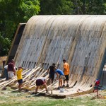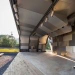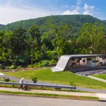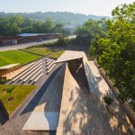 The project consisted of the complete redevelopment of a post-industrial brownfield into a public park and performance space. The idea driving the design is that the built elements are sculptural forms emerging out of the landscape of the park. The park is a series of extruded lawns and carved paths that knit the surrounding urban fabric into the site’s circulation. Steam-bent white oak walls curve to define secluded pockets offstage and intermediary zones of varying intimacy, allowing performers to slip in and out of audience view. The interior walls and ceiling of the shell are sculpted to naturally project acoustics toward the audience. The backstage area is conceived as a creek-side terrace. The rough-sawn white oak cladding dampens the noise of the rushing creek water, muting it from the stage and audience. Sound and lighting is controlled from a covered booth: an oak wedge, nested at the corner of the seating area. The material pallet anchors the project in its context, while the timeless contours reflect the creativity and aspirations of a forward thinking community.