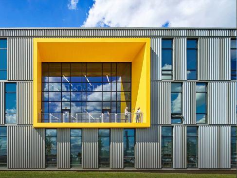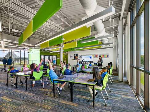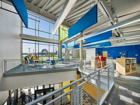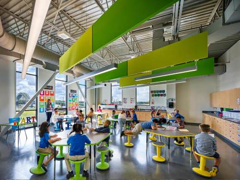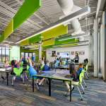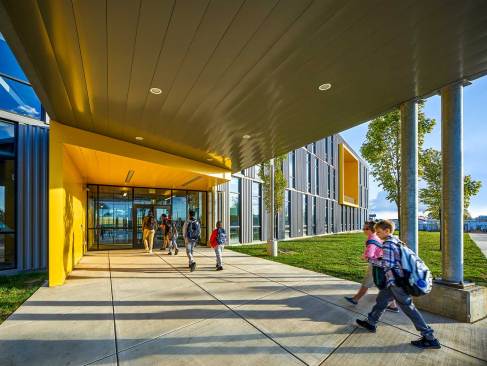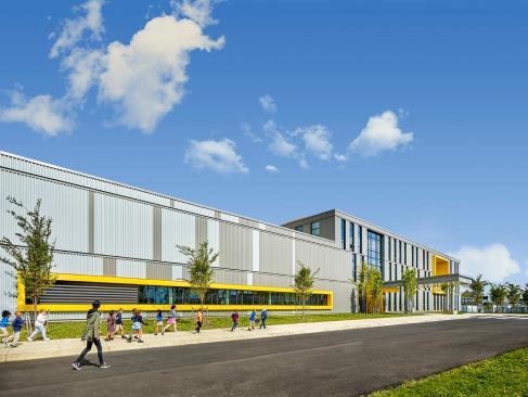 Founded in 1999 and currently serving 4,500 students, this Philadelphia Charter school is recognized for its unique approach which incorporates art and robotic design into science, technology, engineering, and math curriculum. To accommodate a growing student population and provide an exceptional list of extracurriculars, the design needed to engage with the surrounding environment. MaST acquired 19 acres located on a former industrial site on the banks of the Delaware River, providing striking views of the Tacony-Palmyra Bridge. The exterior, with its grey corrugated metal panels and yellow composite metal paneling, is reminiscent of stacked cargo containers, paying homage to the site’s rich maritime commercial history. Phase 1 of the project is positioned to provide the maximum space needed to create both an additional building as well as outdoor learning spaces for the Philadelphia region’s booming student population. The first phase of MaST II Tacony opened at capacity, housing 600 students in roughly 30 classrooms, complete with specialized learning spaces to accommodate a modernized STEM education program.