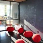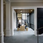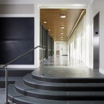 Intended to be used as a teaching tool, other sustainable practices are conspicuously located throughout the building. On the roof is a solar hot water heating system and an array of photovoltaic cells for generating electricity for the building; a display at the main entry will show all entering the building how much power is being generated from the sun. Water use is economized by collecting rainwater from the roof into an interior cistern that is visible from the main stair and by installing flushless urinals in the restrooms. A vegetated roof over the flat roof of the science corridor will be readily visible from the floor above. Sustainable and natural material choices, such as concrete flooring, slate, wool carpet, wood fiber ceilings, low VOC paints, Forest Stewardship Council (FSC) certified woods, and furniture made with recycled materials, create an interior that fits the school’s character while respecting the environment.
