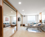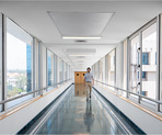 The façade design attempts to exhibit the internal program externally. The parking floors are clad with white cardio graphic louvers, followed by a unitized curtain wall for the ambulatory floors and large punched windows for the in-patient floors above. The color palette mostly includes whites, beiges, and browns, also known as ‘Earth colors’ which is another aspect driven by EBD wherein researchers have found these colors to stimulate healing much more in comparison to other colors. This palette extends seamlessly to its interior with Max Healthcare’s patented green upholstery, creating an interesting contrast. The thoughtfully laid out floor plan secures abundant daylight to almost every programmed area inside the building. Additionally, every single departmental zone along with the waiting areas are adorned with large paintings, in vibrant colors and textures to uplift the spatial and visual ambiance of the facility and ultimately enhance the patient experience as much as possible.