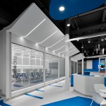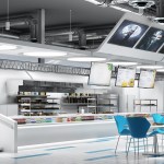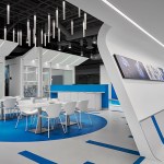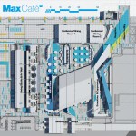 A connecting point for a leading video game company, MaxCafé provides a vital hub to a corporate headquarters serving 700 employees, while offering a wide variety of culinary experiences with menus prepared by world-class chefs. The video game industry is driven by creative genius at many levels, whether in 3D modeling, animation, design, storytelling, and programming, or through executive leadership, sales and marketing, in a challenging business and evolving market. Within this unique coming together of talent and technology, MaxCafé provides a daily forum and hub to energize the many teams and talents that draw from a three-building campus. Products of this video game company span a timeless range based on mythologies, legends, quests, and adventures. Games include settings of the past, the future, or alternate realities. In design and aesthetic, MaxCafé looks ahead to new ideas and visions, and provides a canvas to informally collect and exchange ideas for a broad set of futures. MaxCafé provides a variety of options for everything from a casual lunch to formal business meetings. The large canopy defines space and edge for general seating and tables of four. The Wall of Fame travels next to and through this canopy with a framed collection of best-selling games and AAA franchises. For the short stay, stand-up tables of two and four flank the cappuccino and smoothie bar. A separate booth area behind the grill and salad bar provides a more sheltered and intimate setting, across from a gentle curved wall. Dining/Conference rooms provide a reserved ambience to support private meetings. Multi-purpose monitors have always-on functionality to connect with conference rooms and teams around the globe. To allow privacy or confidentiality, the glass elevations in the CaféBits and CaféBytes conference rooms incorporate smart glass that transitions to opaque when called for (through switches applying electro-chromatic technology). The new dining room quadruples the footprint of the earlier dining room, already previously in a 3rd generation. Menus are served through a U-shaped configuration of counters. Six separately provisioned food serving areas include a salad bar, grill with wood-fired pizza oven, hot foods, wraps & sandwiches, smoothie bar, and cappuccino bar. Under an open 18’ high ceiling in a warehouse space where games were previously packaged and shipped, the MaxCafé is open and airy. Ceiling planes complement vertical planes or echo floor designs. HVAC systems and ducts integrate open or linear diffusers with LED lighting. Control system regulates all displays including in-house media, live games, television, or connecting studio meetings around the world, as well as menus and ordering. An integrated kiosk, online, and mobile ordering system connects a wide array of menu and behind-the-counter displays. Glowing edges and LED lighting throughout illuminate art and milestone images of company products spanning decades. All lighting throughout is adjustable via dimmable LED’s including overhead lighting, table lighting, or edge glows and accents. Lighting controls coordinate LED presets for functions ranging from breakfast, lunch, and dinner to Happy Hours & annual corporate meetings.