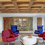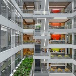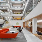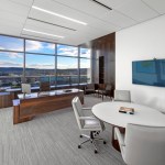 A variety of think tanks, huddle rooms, and collaboration areas complement the workstations. Rethinking the need for private offices, rooms can be reserved for an entire day or longer. In modular groupings, the workstations and complementary spaces create communities and neighborhoods. Wayfinding is highlighted by the use of color that references spices and a consistent layout on floors two through six.