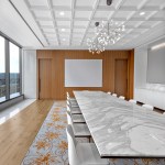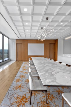 In the executive suite, custom private offices are co-located and provide a high degree of transparency for integration and accessibility. The main conference room features a nearly 50-foot-long conference table and video conferencing capabilities that combine 15 screens. The suite is equipped with advanced technology that supports innovation and represents McCormick’s growth trajectory. IA-designed custom carpets inspired by spices (for example, anise, cinnamon, and vanilla) resonate with graphics, branding, and pride of place elements throughout the facility. Sleek millwork and custom, sustainable furniture with clean lines create a high-end, understated elegance; carefully selected marble is used for the reception desk and some flooring. Wayfinding skillfully maintains the suite’s privacy while also allowing employees to access the adjacent roof garden.