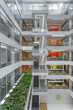 During the buildout, a seven-story atrium with skylight was added, bringing natural light into the facility and creating a stunning design feature and first-floor gathering space for staff and visitors alike. On one side of the atrium, a pantry is positioned at the same location on each floor visibly overlooking the lobby, heightening the sense of community. Opposite, a 60-foot-tall, 20-foot-wide display screen projects videos and images celebrating McCormick’s innovation, global supply chain, and sustainability journey. Within the atrium, at the third floor, a partial roof with living greenery adds a biophilic touch.