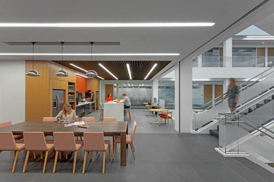 The company offers regular exercise classes in the campus’ fitness center. An emphasis on active design further supports the building’s focus on wellness. IA researched and carefully planned the distances from work areas to resources, central amenities, and interconnecting stairs to invite movement.