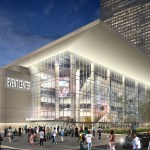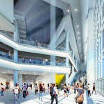 Smaller scale vertically corrugated galvanized metal pavilions are located intermittently around the building. The pavilions house restrooms, concessions support spaces, stairs and elevators. At night, the glass will be lit from behind, its glow visible to pedestrians at the street level and patrons in the main concourse.