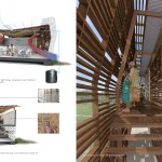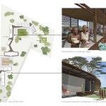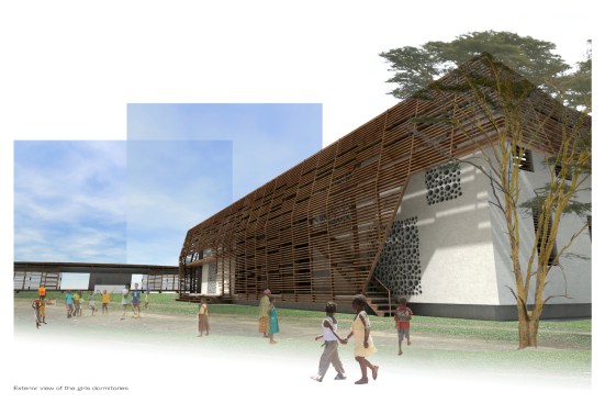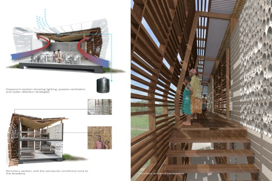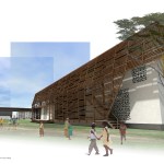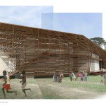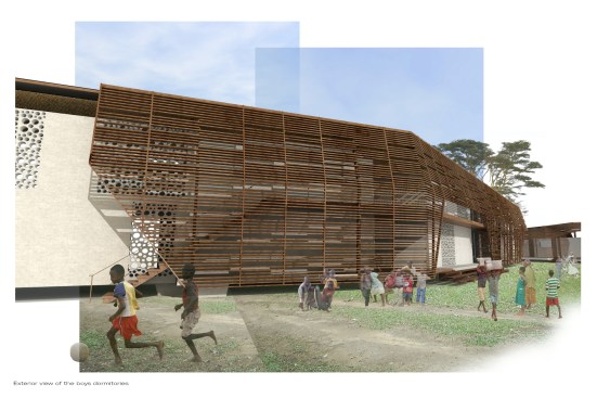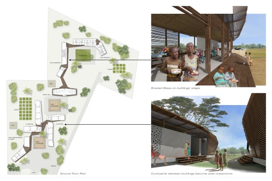 STRUCTURES—The plan includes a library, staff meeting rooms, a dining hall, 2 academic buildings, 2 dormitories, and a staff residence. Each building provides naturally shaded areas for the children to play and do their homework. Filtered light will come through the concrete blocks and the windows sheltered by the overhanging roofs. Large wood screens will provide further shadow and covered staircases. The spacious buildings would be built from local materials such as pre-cast open patterned concrete block and bamboo woven walls and screens, and have large roofs cantilevering over the walkways to shelter from the rain and sun. Large reclaimed wood screens will form shaded areas for the children to do homework and read.